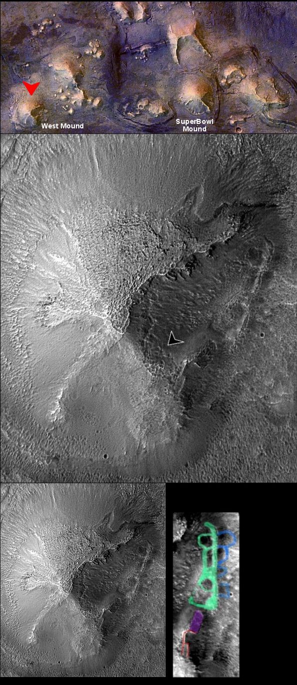 The West Mound is an excellent candidate to be the ruins of an artificial arcology. It shows many features consistent with arcology collapse. The eastern flank of this arcology candidate appears to have caved into a hollow interior, leaving ruin-like anomalies around the southern and eastern sides of the resulting depression. Not the least of these anomalies is the room-like honeycombing on the eastern edge of the hollow, which is indicated by the black arrow. The West Mound is about two thirds of a mile across. For more information click this "stargate" µµµ C