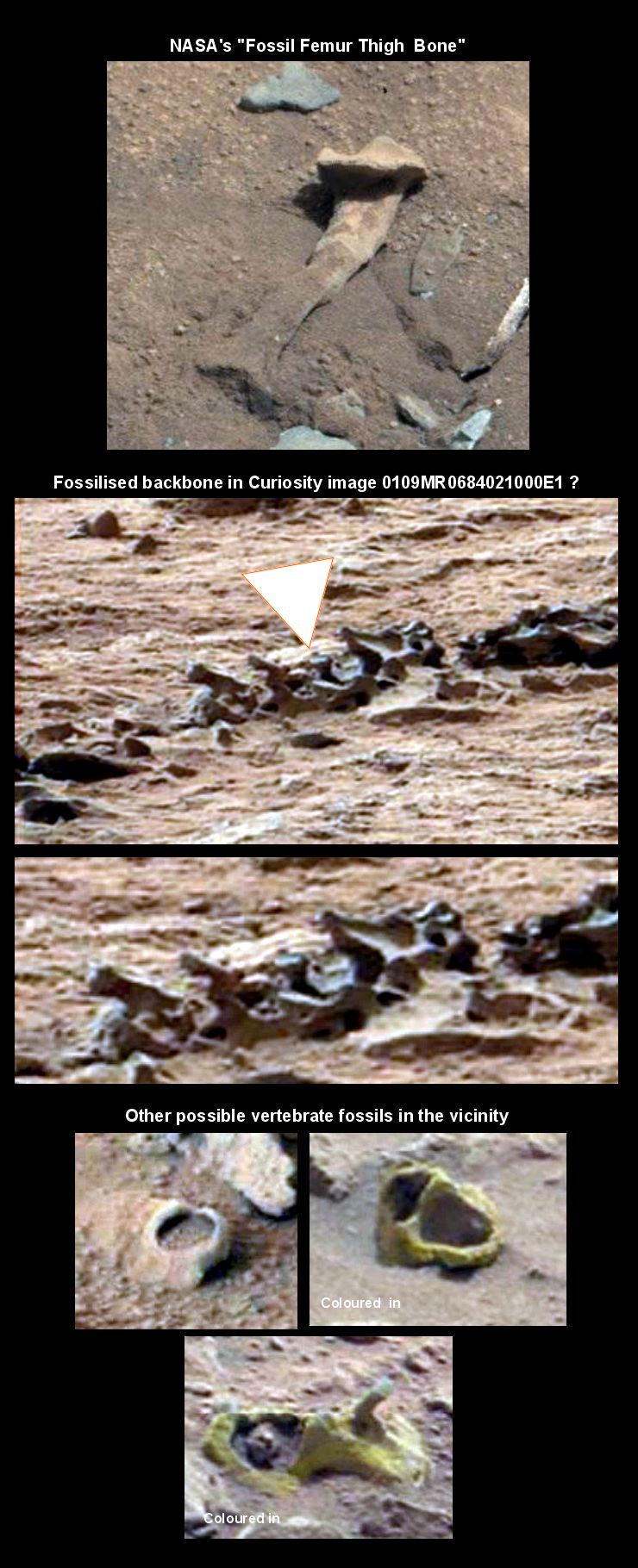 The official NASA image caption for the first image below reads – “No bones about it! Seen by Mars rover Curiosity using its MastCam, this Mars rock may look like a femur thigh bone. Mission science team members think its shape is likely sculpted by erosion, either wind or water. If life ever existed on Mars, scientists expect that it would be small simple life forms called microbes. Mars likely never had enough oxygen in its atmosphere and elsewhere to support more complex organisms. Thus, large fossils are not likely”..... However, if Mars was artificially terra-formed by an advanced civilisation tens of millions of years ago, then the terra-formers may well have introduced their complex alien animals to this newly created habitable biosphere. This is not the first time that Curiosity Rover has spotted possible fossil bones. Earlier in its mission Curiosity imaged what looked like vertebrate bones from backboned creatures. These are shown in the lower images. For the original NASA image and caption click this "stargate" µµµ C