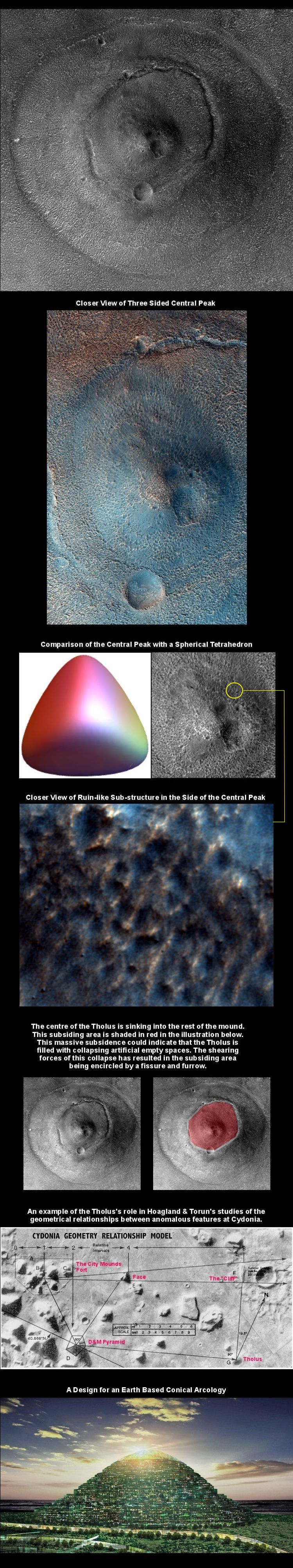 Readers of Hoagland's "The Monuments of Mars" will know that the Tholus is a possible conical shaped arcology about a mile across. (Arcologies are massive self contained habitations that can house substantial populations – a town or city contained in a single building). In the Hoagland & Torun geometrical alignment model of Cydonia it forms a triangle with the D&M Pyramid and the "Cliff" with internal angles progressing through 30, 60 and 90 degrees. Much of the surface of the Tholus is densely honeycombed in a ruin-like way - something it has in common with other possible Cydonia arcologies such as the D&M Pyramid. The Tholus has an unusual central peak, which has the form of a 3D geometrical shape called a Spherical Tetrahedron - if a heavily damaged one. The centre of the Tholus appears to be subsiding into the rest of the mound. This suggests the Tholus may have contained many empty spaces, as the artificial arcology model would predict. As a result of this subsidence shearing forces have created a fissure and furrow that encircles the area that is sinking. For a deeper description of the Tholus click this "stargate" µµµ C