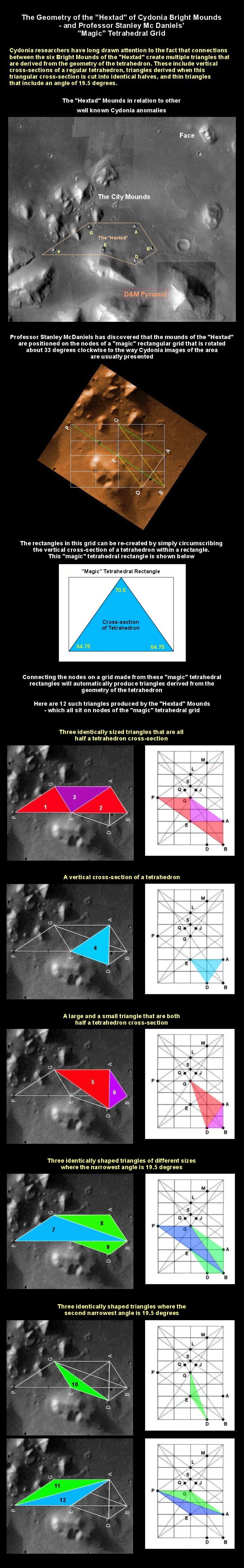 The Bright Mounds are a geometrical anomaly that grew out of studies by Hoagland and Torun of the apparent geometric positioning of the proposed artificial structures in Cydonia, e.g. the Face. The Bright Mounds consist of an array of faceted mounds that range between the size of the Great Pyramid of Giza, and twice its size. They are scattered between the much bigger mounds of Hoagland's Cydonia City and part of the way to the D&M Pyramid. Hoagland noted the mounds seemed to be located at the vertices of triangles that were derived from the geometry of the tetrahedron. Analysis by Dr. Horace Crater of all the possible angles between the Bright Mounds finds that the 19.5 degree angle is the most common angle (under a maximum 90 degree cut-off). The 19.5 degree angle is especially unique to tetrahedral geometry. An array of six of the Bright Mounds - the "Hexad" - is particularly rich in tetrahedral triangles. Professor Stanley McDaniels has shown that this "richness" is due to the Hexad mounds being located at the nodes of a unique rectangular grid. The rectangles in this grid are themselves derived from tetrahedral geometry - and when they are arranged in a grid the nodal points automatically produce a large number of tetrahedral triangles. Ten million random computer simulations by Dr. Crater have shown that the Hexad geometry is difficult to replicate as a chance arrangement. Click this "stargate" to read more about geometric evidence for artificiality at Cydonia µµµ C