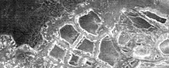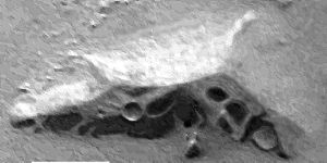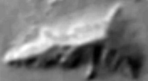 c If an image of the D&M is made with much less aggressive contrast enhancement then another interesting item of symmetry is revealed by this new thermal image. Since the D&M Pyramid was first discovered on the Viking images it has been observed that there is a vaguely triangular depression near the top of the East facet. It has been suggested that this may be subsidence due to a roof collapse in an internal artificial chamber. This feature can be seen in the Mars Odyssey visible light image below, left. The outlines of this feature can also be made out in the infra-red image of the D&M below, right. The interesting thing is that this depression in the East facet is symmetrically matched by a large cool spot at the top of the West facet. c CCCCCC C A possible explanation for this cool spot anomaly is that some of the heat hitting this part of the West facet is leaking away into an internal chamber before it can be re-radiated back to the external environment. We therefore have two separate types of evidence that two hollow chambers were/are arranged symmetrically and architecturally near the top of the D&M. Is there a test for whether the above image enhancements of the D&M are showing actual hidden features? One way of assessing whether these apparent D&M structural elements are real is to see what structural looking features seen in visible light look like in this new daytime IR image. Happily the new daytime IR image also captures the "Citadel", an anomalous mountain which may be a large arcology with collapsed chambers, (see middle image below). The sunlit slope of the "Citadel" in this Viking image exhibits a slightly raised grid-like pattern with the possibility that some kind of roof is sagging between hidden supporting walls. The first of the two images below shows the "Citadel" as it appears in the new daytime IR image. The third image zooms in on the sunlit slope where the grid effect is observed in the Viking picture and subjects it to the same ultra-contrasting that was applied to the D&M. It can be seen that the thermal image creates the impression of a cell-like arrangement of open chambers consistent with the grid seen in Viking's visible light image of the "Citadel's" surface. The architectural looking arrangement of the cool and warm spots on this slope of the "Citadel" provides some circumstantial evidence for the possible existence of artificial chambers beneath the surface. It certainly shows that the IR images can pick up on structural looking details in a different way than visible light cameras can. c ccccccccccccccc cccccccccccccccccccccccccccccc ccccccccc c An interesting surprise. The enlargement below shows an interesting anomaly which appears in the extreme South of the new Cydonia IR image. This is an almost perfectly rectangular arrangement of walls and mounds almost as large as the "Face". The space enclosed within the rectangle is further sub-divided by internal walls. It has the appearance of some gigantic ruined building. It would be very interesting to see what it looks like when imaged by the higher resolution visible light cameras of the Mars Odyssey or the Mars Global Surveyor. C ccccccccccccccccccccccccccc C Conclusion. Even though the IR imaging system of the Mars Odyssey only has a resolution of 100 metres per pixel its capabilities to find evidence of artificiality when used in the night-time mode seem to be awesome. The preceding speculative analysis of the first daytime IR image of Cydonia suggests that a full night-time IR survey of this enigmatic region would discover many new anomalies. Here is checklist of some of the things that Cydonia enthusiasts would hope might be uncovered in night-time IR images. (A) The edges of things such as the "Face", D&M Pyramid and the formations in the "City" are buried under sand and debris. If these formations are artificial then we may be able to see the buried boundaries of these anomalies. These boundaries in turn may be very straight edged and suspiciously geometrical. c µ Return to the Enhancements page