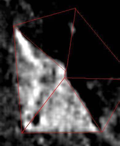 | C Ccccccccccc c What can the new daytime infra-red image of Cydonia tell us? On the 24th July 2002 the Mars Odyssey team published the first daytime infra-red image of Cydonia, capturing the "Face", "Fort", D&M Pyramid and the "Citadel", (click "stargate" µµµ). Mars Odyssey's daytime infra-red (IR) images look remarkably like normal pictures capturing visible light. This is not surprising as surfaces receiving a lot of sunlight be will be warmer that surfaces in shadow. In fact daytime IR images actually show less detail than a comparable picture at the same resolution using visible light. A visible light picture provides a great deal of detail about the surface of an object through a wide range of different reflected shades. However, because heat is conducted through materials the surface of the same object will tend to be almost uniformly warm. The "shades" of infra-red re-radiated from the surface will therefore be fewer than in the case of visible light. One only has to think of the difference in detail between a normal photograph of a person and a thermal image of that same person to realise this. ...And yet... Whilst perusing the new image this researcher couldn't help but notice that the "heat shape" of the D&M Pyramid did not match the actual shape revealed in the Mars Odyssey visible light image released in April 2002. The difference was in the West and South facets of the D&M where the separating ridge line was invisible, but other thermal features were very prominent on the West facet. It therefore seemed to be a good idea to enlarge and subject the D&M to extreme contrast enhancement methods to accentuate small heat differences on the sunlit surfaces. (The TIF format file version of the image was used for this exercise). As the result below shows there are interesting patterns of warmth and relative "coolness" in the image that suggest hidden structure beneath the surface of the West facet, (the left hand facet in the image). There is even some symmetry between the two halves of the West facet if it is divided along a line running from the peak of the D&M to the ground. (The red lines in the image show the placement of the actual perimeter and ridge lines of the D&M). C cccccccccccccccccccccccccc