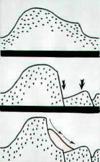 The diagram on the right illustrates what I think is happening in the Fort using a simplified West-East cross section. The top drawing represents how I envisage the original cross section to have looked like before the Fort began to slump. At this stage the Deck is at a higher elevation and is just an eastward extension of the western ridge of the Fort. In the middle drawing of the diagram the Deck section of the Fort then slides into the ground, creating a cliff on its inward side and the moat like rift with the plain on its outer side. The inner side of the Deck sinks further down than the outer side causing the slumped interior of the Fort. In the bottom drawing of the diagram the cliff left behind by the Deck's subsidence then gives way to create the landslides observed in the Fort's interior.