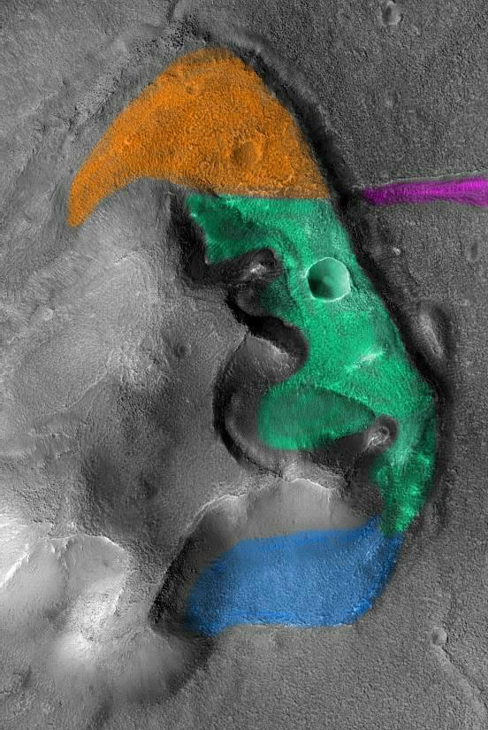 In the main illustration below I have coloured the Deck section of the Fort in green and orange. This is because although the northern part of the Deck seems to be tipping downwards towards its southern end it does not exhibit the same degree of subsidence as the part of the Deck coloured green does. In the illustration I have coloured in where I think the Deck extends below the landslides. The area I've coloured in blue is an intriguing one. Its outer edge is delineated by a low wall. Is this faint wall feature actually the original southern edge of the Fort? Although there is little to support the hypothesis, it may be the case that the blue area represents part of the Fort that has sunk down to ground level and is just an extension of the Deck. As a footnote, many parts of the surface of the Fort are covered with the same kind of "crocadile skin" effect that has already been noted on other Cydonian formations.