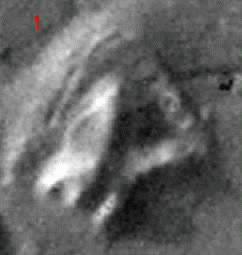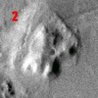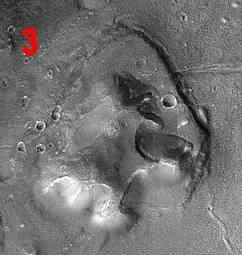 Images of the Fort taken by the MGS reveal that its interior is less geometrical than hinted at in the Viking pictures. Although the interior is subsided, it does not form a "courtyard" or "courtyards". The ramparts effect seen in the Viking images is thus an illusion. There seems to be no further reason to think that it is an unfinished arcology. This is a great disappointment because an arcology abandoned in it construction phase would probably have provided proof of the arcology model of Cydonia. Dr. Mark J. Carlotto has attributed the "rampart" and "courtyard" effect in the Viking images to the shadow thrown by the Fort's higher western ridge. However, I believe the main culprit is the dark colour of the landslides within the Fort's interior. Illustration #4 above is a deliberately degraded version of the MGS image (illustration #3) in order to replicate the Viking camera's level of resolution. It can be seen that the landslides immediately make the Fort's interior look very mysterious again.