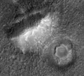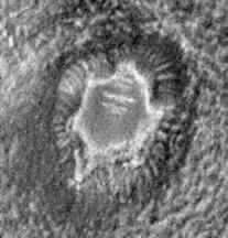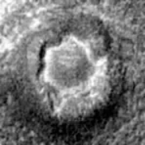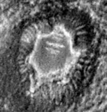 Was the "Hexagon" once covered by a dome? There is nothing in the "Hexagon" image to support this proposition. However, there is another feature in the new image strip that sits in the centre of a sharply defined moat which suggests that the "Hexagon" may once have been protected by a dome. This is a moated dome around two thirds the diameter of the "Hexagon". It is shown in the images below. Of course there is no way of ascertaining from the MGS image whether or not this dome actually contains a hollow interior space - but could it contain structures just as interesting as the "Hexagon": and could such hypothetical contents still be in pristine condition?