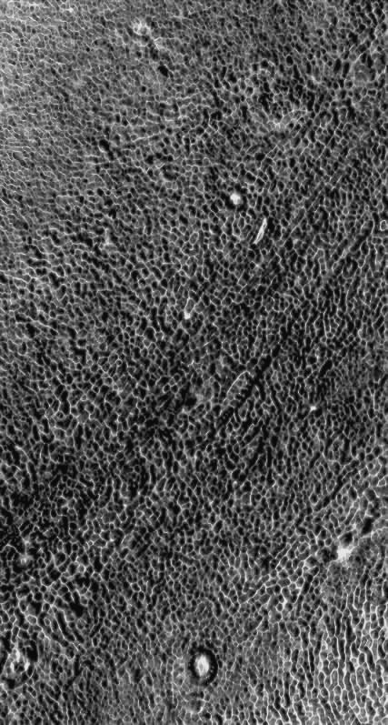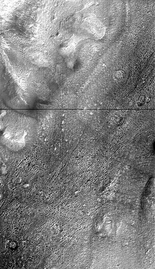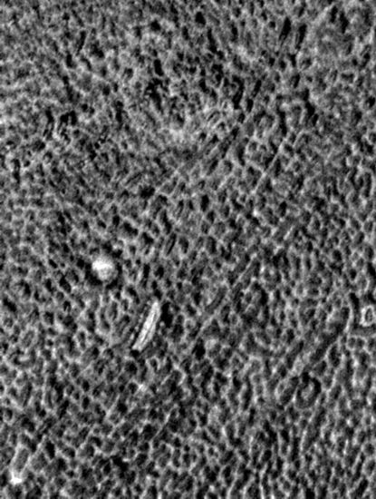 | In order to give the reader a better idea of what the suburbs look like I've enhanced and reduced in size by 50% the relevant portion of image SP1-23903. The black bar crossing the image is due to "transmission failure" from the MGS. . (This text continues below the next picture). c cccccccccccccccc As always with these outsized images the reader is advised to use the "View" then "Full Screen" options from the menu bar at the top of their browser screens to see more of the image clearly. c During 2000 the part of the "Suburbs" above the "transmission failure" in the 1998 image was captured by the MGS at a higher resolution in image M22-00378. This new image seems to confirm some ideas I had when looking at the earlier 1998 one. TEM's 1998 visual analysis compared the "Suburbs" to a ruined city such as war-time Berlin. This gave the impression that the "Suburbs" could be the remains of an above the surface city with the walls surrounding the enclosures being the ruins of actual buildings. However, on examining the 1998 image it seemed to me that the walls were fairly level with the surrounding landscape and that the enclosed areas were originally below that level. I concluded that if the "Suburbs" were artificial then they must have originally been covered under the same roof with the walls acting as support. This conviction was increased when image M04-01903 was released in April 2000 revealing the area Cydonia Quest has named the "Cydonia Grill". The "Grill" area shows a steady progression from deep pits opening up in the ground and then progressively widening out into a landscape of deep rectilinear depressions. As far as one can make out the cause of the "Grill" appears to be the collapse of the ground into pre-existing (and massive) underground chambers and corridors µµµ. Ep The picture below shows the part of the "Suburbs" that has been captured in the new higher resolution image, but reduced in size by half to load conveniently on to this web page. As can be seen the walls of the "Suburbs" form quite a regular geometric grid over many parts of the image. Other parts of the picture, such as the extreme bottom right hand corner (where a slope has been eroded through these formations) look less artificial. The feature at the bottom of the picture is the "Dome" which has already been covered elsewhere µµµ. C c ccccccccccccccccccccc As always with these outsized images the reader is advised to use the "View" then "Full Screen" options from the menu bar at the top of their browser screens to see more of the image clearly. c The following image shows a portion - towards the top right - of the preceding image at the original resolution sent back to Earth. It contains many examples of building-like rectangular enclosures. C cccccccccccccccccccccc c This analysis of the "Suburbs" contains many large images, so I've split it up into more than one page to allow easy down-loading. Click on the "Stargate" below to find out what the new MGS image has discovered about the true nature of the "Suburbs". µ The "Suburbs" : Part Two