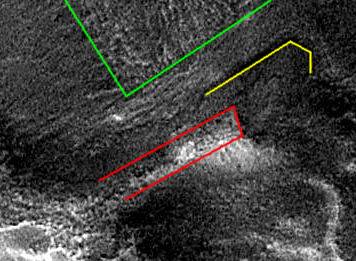 As always with these outsized images the reader is advised to use the "View" then "Full Screen" options from the menu bar at the top of their browser screens to see the images more clearly. C The MGS image of the east side of the D&M is of poor quality - perhaps due to the Cydonia skies being dusty when it was taken. The illustration below shows the D&M's apparently collapsed satellite at full resolution. The reader will note that it is not very clear. However, there does seem to be a cellular pattern on the higher surfaces, which probably corresponds to those we saw in Part One in the very highest resolution image through the centre of the D&M. It can also be seen that the southern and eastern walls of this hypothetical satellite arcology only remain in residual form and that the interior of the gaping hollow is also subdivided by what may be the remains of interior supporting walls. (Although these sub-divisions are easier to make out in the reduced D&M illustration above). C cccccccccc ccccccccccccccccccccccccccc C This image of the D&M's collapsed satellite shows an underlying parallelism in the two sides of the wall that remains on the north side of this collapse feature. It also ends in a suggestively angular way. This is shown in red in the smaller illustration above. The other lines show straight features in the landscape that trend in the same general direction as this northern wall. Malin Space Science Systems have promised to re-image the east and west sides of the D&M at the very highest resolution. Hopefully, a new, clearer image of the D&M satellite mound will provide fine detail information that will give some clues as to whether or not it is a long ruined arcology. As the larger illustration of the two above shows, there are some other puzzling features in the area around the collapsed satellite.