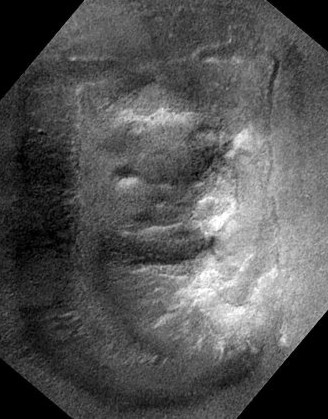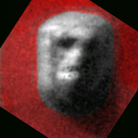 The image of the "Face" presented at the press conference was quickly dubbed the "Catbox" because it looked like scratchings in kitty litter. As I've learnt more about the computer enhancement of images I've come to realise that the "Catbox" image was not the result of botched processing, but of a properly processed image being deliberately degraded. Lan Fleming has made a fairly good job of replicating how this de-enhancement was done. One of the biggest surprises is that the artistic effect of "embossing", available in most image software, was probably used. Embossing is not an enhancement technique. (Click on the "stargate" to read Fleming's "Catbox" study µµµ). It is not entirely clear why anyone within NASA or JPL felt compelled to sabotage the image of the "Face" to be presented at the press conference. The corrected image released a few hours later showed a heavily eroded formation that could have equally have been ruins or rocks (see image on right). Moreover, the new image was poorly suited for showing whether the facial features seen in the Viking pictures stood up under higher resolution or whether there were any constructional features in evidence.