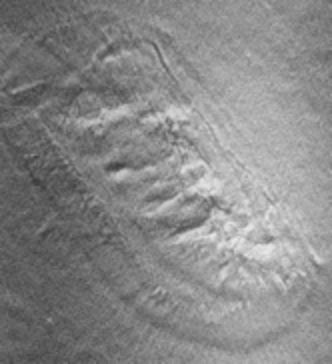 In order to solve the mystery of the eastern side of the "Face" DiPietro and Molenaar set out to track down any other Viking images of the "Face". This led to the discovery of image 70A13 in which the Sun was at a much higher angle in the sky. The new image confirmed the symmetry of the "Face" platform and the general bi-symmetry of the facial features. Not only were there "eye sockets" on each side of the "Face" but the one on the western side had a feature like a "pupil/iris" in it. The trawl of Viking images also began to reveal that the "Face" was not the only anomalous looking feature in this area of Cydonia. A few miles to the South of the "Face" they found a curious five sided "pyramid" - now known as the D&M Pyramid after its discoverers. The Cydonia question was beginning to snowball. (The images to the left and right are from Dr. Mark J. Carlotto's enhancements of the low and high Sun angle Viking images of the "Face". I've coloured in the surrounding Cydonia plain to emphasise the base of the "Face" platform). C A funny thing happened on the way to Mars The Cydonian anomalies opened up the possibility of a 2001: A Space Odyssey situation of the sort that the Brookings Report had warned NASA about at its inception. However, there was only one thing wrong with the Cydonia formations - they were so damn big! The "Face" formation was one mile in length. Most scientists just dismissed the whole idea out of hand. Planetary SETI seemed too much like pseudo-science. The only way to make progress was to get more and better pictures of the Cydonia region. The only problem was that NASA had completely lost interest in Mars.