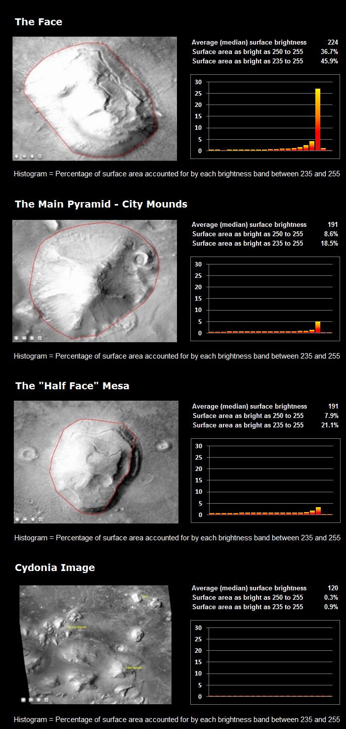 Nearly 37% of the Face's surface is as bright as the 250 to 255 range - against less than 9% for the Main Pyramid, and less than 8% for the Half-Face mesa. Only 0.3% of the general Cydonia region was as bright as this.