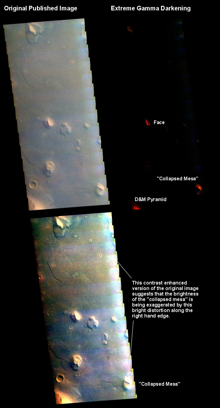 The "Collapsed Mesa" is also about five miles further east than the Face. Mars is a small planet with quite a tight curvature. It is likely that the twilight seen at the mesa is slightly brighter than that seen at the Face or D&M Pyramid as a result. (In contrast enhanced versions of the twilight image the ground gets darker as the view moves westwards. This could be a confirmation of a curvature effect).