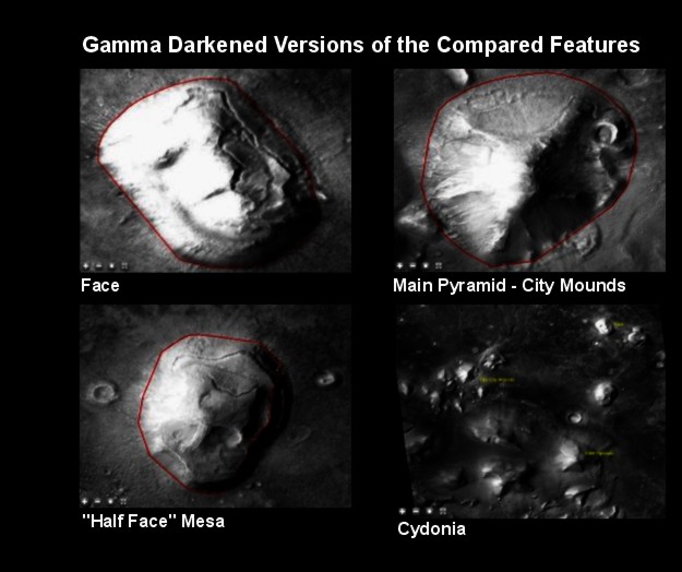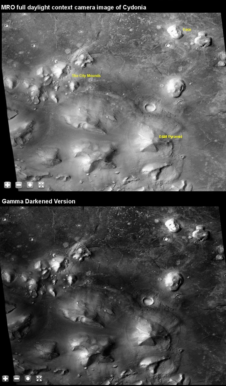 This can be seen in the illustration below, which covers the familiar triangle formed by the Face, the D&M Pyramid and the City mounds. The second image in the illustration is gamma darkened. Gamma darkening darkens the dullest image pixels first, which has the useful effect of isolating the brightest parts of an image. Readers will find that their eye will tend to be drawn to the top left corner of each image, because of the Face's consistent brightness. (Source image here µµµ). c