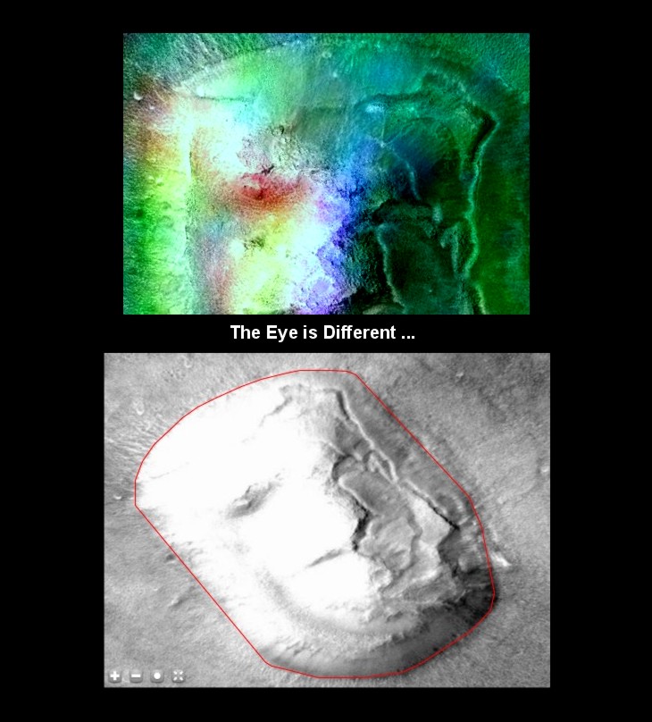 In one of Laney's de-correlation stretch images overlaid on the Face it is quite obvious (by the red colour) that the "eye" has a different mineral signature than it's immediate surroundings. This is shown below.