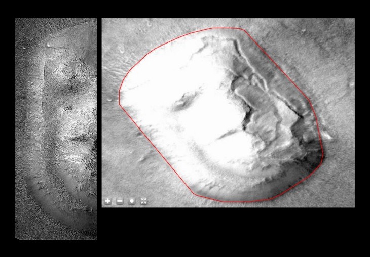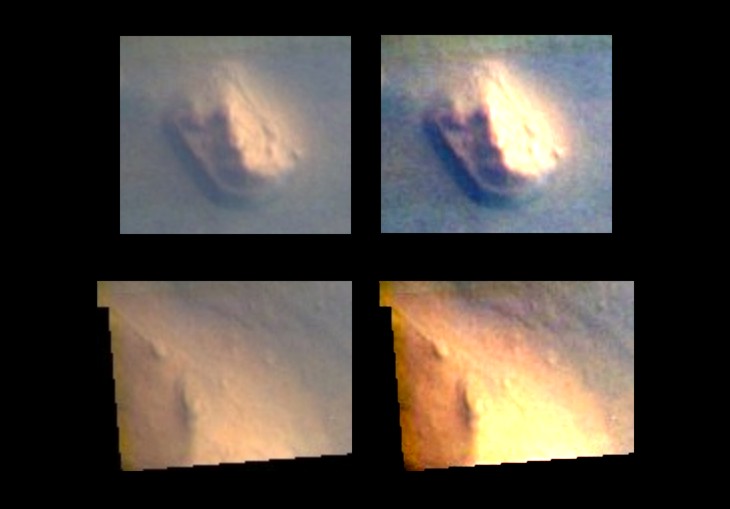 The Face's relative brightness can be seen below in the officially processed version of the image and one processed by Keith Laney µµµ. The latter image has been contrast enhanced to recreate the twilight effect at the time the image was taken.