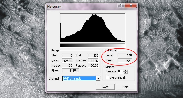 C It is possible to more scientifically measure this "consistency of brightness". Image editing software allows users to draw boundaries around features and to get a histogram and statistics describing the brightness profile of the chosen area. The histogram is divided into 255 levels of brightness, with zero being totally black and 255 being pure white. The mouse cursor can then be used to read off from the histogram the number of image pixels matching any brightness level. In the illustration below, one such read-off is circled in red. C