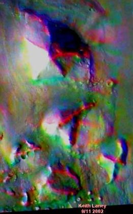 µµµ The Enterprise Mission's preliminary analysis of the "real" image controversy µµµ "Anatomy of a Bamf" by Mars News.com µµµ Keith Laney tells his own story The nine multi-spectral IR images of Cydonia released on the 24th January 2002 on the Mars Odyssey website (click µµµ) should illustrate one of the amazing features of that spacecraft's THEMIS camera. Basically, materials of different compositions - hard rock or soft dust - or of different mineral make-ups re-radiate the heat of the Sun in different parts of the infra-red spectrum. By taking several images in different parts of the IR spectrum almost simultaneously of the same spot on the Martian surface the THEMIS camera collects very detailed information about an area's geology. The standard way of analysing such multi-spectral IR images is to merge them together using a process called "de-correlation stretch". This gives a false colour to each of the bands in the IR spectrum and then emphasises where patches of the surface have unique IR spectral signatures. It is these unique signatures that will allow detailed mineral maps of Mars to be compiled one day. The images below give an idea of the resolution of the THEMIS camera and provide an example of what de-correlation stretching of multi-spectral IR images can achieve when overlaid onto visible light images. (Both images are of Earth taken by satellites. Readers wanting to know more should click this "stargate" µµµ. For those with fast modems full sized versions of the images can be seen here µµµ and µµµ - images 3.2 megabytes and 2.8 megabytes in size respectively.) cccccccccccccccccccccccccccccccccccc cccccccccccccccc C It wasn't immediately apparent to Keith Laney that he had downloaded an entirely different version of the multi-spectral IR images of Cydonia from everyone else and he was very un-impressed by what he saw in the version he got. (The probable reason why Laney was targeted for the leaked image is that he is the only member of the Cydonia community who processes raw Mars images for NASA - see µµµ). Co-incident with the release of the first daytime IR image of Cydonia the person who had processed the THEMIS images for the Mars Odyssey programme - Noel Gorelick - became a regular contributor to the old Enterprise Mission conference board and chat room using the pseudonym of "Bamf". (The source for "Bamf" can be traced to a cartoon character, an acronym of a very crude phrase.....and web speak for re-directing an unsuspecting internet user to a web page designed just for them in mind). Whilst extolling the virtues of multi-spectral IR imaging, Gorelick constantly tended to downplay the practical value of the 24th July images that he himself had processed and uploaded to the Mars Odyssey website. (As both a participant and spectator to events on the conference board at the time, this was my strong impression of what Gorelick was conveying). He even referred to them as just being "pretty pictures" displayed for demonstration purposes only. Yet despite this disclosure Gorelick had objected earlier to Keith Laney's assertions that the same images where useless, in a strange display of inconsistency. Now Gorelick's conference board persona - "Bamf" - is quite provocative and Laney was challenged to process the multi-spectral images using de-correlation stretch. Laney was not versed in multi-spectral IR image processing and it was only with advice from Noel Gorelick that he was able to quickly master these skills using ENVI 3.5 software, (click "stargate" for details µµµ) . (Note - It has been suggested by some that the Noel Gorelick frequenting the old Enterprise Mission conference board and chat room could be an impostor. However, Mr.Gorelick is well aware of the activities of "Bamf" and after several months has not come forward to denounce him as an impostor). It was at this stage that things got interesting. Laney was able to produce beautiful de-correlation stretch images of Cydonia by mixing different combinations of the IR bands, just like in the previous examples - but he also got something else. The plains areas of Cydonia were everywhere covered with rectilinear grids. Laney was in contact with the Enterprise Mission and it soon became apparent that nobody else could replicate his results - not just the grid pattern, but not even anything that looked like de-correlation stretch images. That's when it became apparent that Laney had downloaded a different image from everybody else. Although the images now available on the Mars Odyssey website look great, each image has too much underlying "noise" to merge in any meaningful way using de-correlation stretch. The Enterprise Mission (TEM) concluded that Laney's image was a leak of actual data from the THEMIS camera by a mission insider and that the multi-spectral image set currently available on the Mars Odyssey website has been deliberately degraded as part of a cover-up to suppress evidence of artificiality on Mars. As a prelude to publicising the de-correlation stretch results from the leaked IR images TEM published the leaked images on its website on the 30th August with the request that interested parties try using de-correlation stretch on the data. Click this "stargate" µµµ to compare the leaked images with the official image set. (TEM had arranged for readers in America and Canada to get a free trial of ENVI 3.5 from its makers). This is when TEM found itself under fire. Firstly, what TEM was now calling the "real" images had less visible detail than the "official" images. TEM explained this by pointing out that because heat is conducted through solid material, even into small shadowy areas, any surface will look more uniform in IR than it does in visible light. Now interestingly I had made the same argument to explain a perceived lack of detail in the "official" version of the images in an analysis that was published on Cydonia Quest on the 31st July, (µµµ). TEM were now claim
