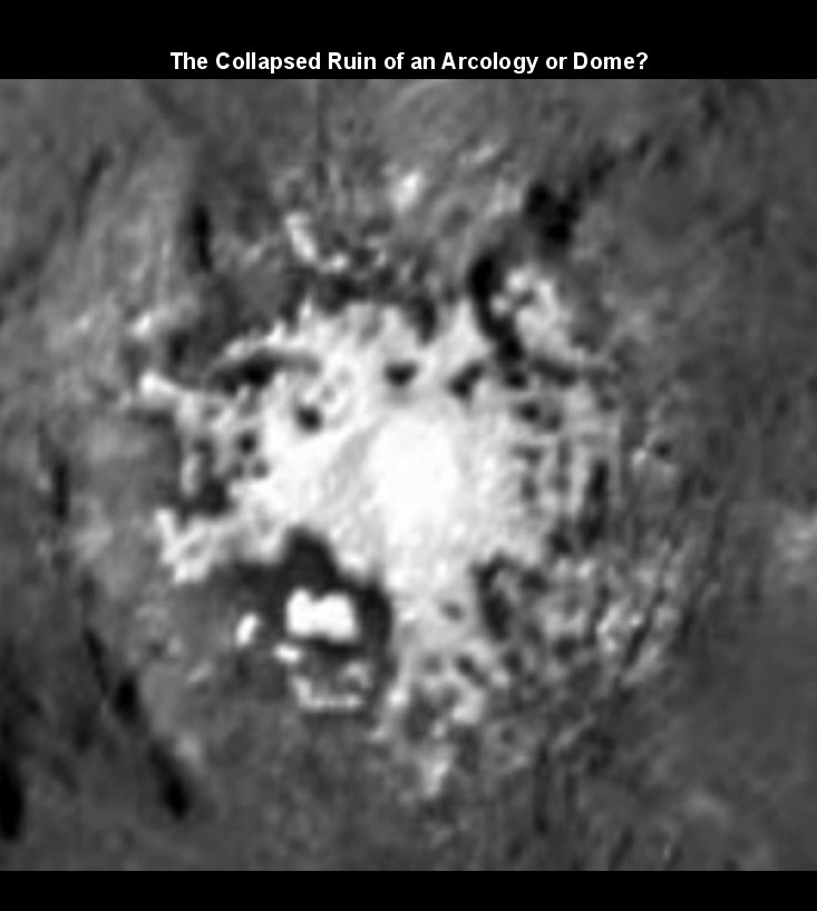 In terms of the artificiality hypothesis it's appearance suggests a collapsed arcology or arcology dome. (An arcology is a single self contained habitat able to house the population of a town or city). C Figure 9 - Extreme enlargement of Light Zone 1