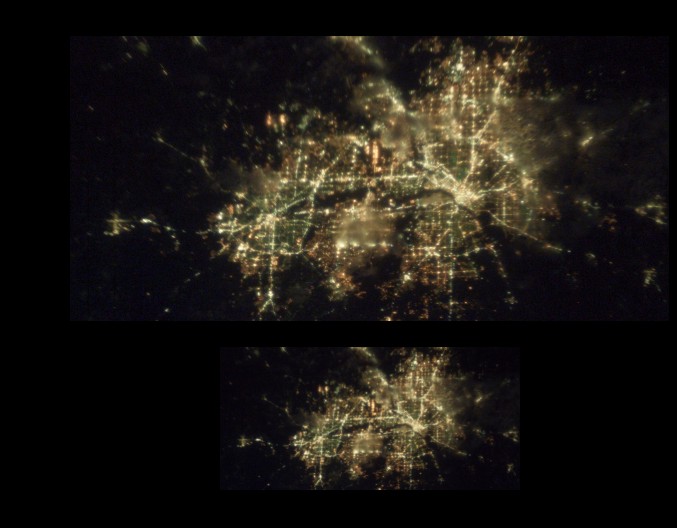 The image below shows the glow of Dallas and Fort Worth at night (with clouds). The lower image has been reduced to a similar resolution to the new image of the Ceres "Lights". In the analysis that follows it will make a good comparison with the geometry that can be discerned in the new "Lights" image. C Figure 6 - The night-time geometry of the Dallas and Fort Worth lights