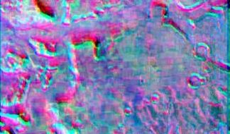 So, how can we be sure that the roughly rectilinear cells in the illustration above are not just amplified noise in the "official" version of the 7.88 um band image that I chose for this exercise? Well, the best solution is to compare the location shown above with part of the image with a comparable flat area that does not exhibit evidence of such rectilinear cells. The control area chosen (above left) is the featureless plain at the extreme bottom left hand corner of the "official" image, (see µµµ). If we compare the BUMP map of this control area with the similar BUMP map for the plain between the "Fort" and the "Face" we see that the two areas are very different in 3-D appearance. In the control area "blockies" follow slightly sloping "tramlines" set by the residual traces of the scan line noise. (If you stand away from your computer these scan lines will become easily apparent). The square'ish "blockies" also have a very shallow looking 3-D appearance. In the case of the "Fort" and "Face" area the rectilinear cells do not align with the downward (right to left) slope of the scan lines - and instead of "blockies" we see a rectilinear arrangement of thermal "walls". These "walls" in turn have a greater 3-D depth and solidity in the BUMP map than is the case for the control area. If both of the images above are smoothed or blurred gradually at the same rate, then the "blockies" in the control area disappear long before all of the "walls" in the "Fort" and "Face" area do. So we can be confident that much of the rough grid seen in this area corresponds to something real in the infra-red and are not noise artefacts. An extended report on the thermal grids found in the "official" IR images of Cydonia can be perused by clicking the next "stargate" µµµ. This is all very relevant to the Enterprise Mission's championing of the ENVI decorrelation stretch results from the leaked "real" IR images. It isn't just these leaked images that are showing a thermal grid, but the "official" versions are too. However, the control area image above is also warning us that there is an underlying "blockie" noise in the original data that underpins both the "real" and "official" IR image sets. This is showing up as false grid patterns in many or most parts of the "real" image after decorrelation stretching. An example of this false grid effect is shown in the two images below. In the first illustration, which is taken from the "official" IR image, we can see some very prominent scan line streaks that Noel Gorelick has not been able to lift out of the picture. These are visible as faint dark lines sloping slightly down from right to left. The second illustration shows the same area taken from Keith Laney's decorrelation stretched image using the "real" IR image set. It can be seen that the rows of rectilinear cells in the ENVI processed "real" image follow the slope of the scan line streaking, and actually seem to be guided and bounded by them. Now my conclusion (to which the reader is free to disagree) is that this is because these particular grid patterns are artefacts created by an image enhancement/filtering process that was applied to the "real" images before they were leaked to Keith Laney. C cccccccccccccccccccccccccccc