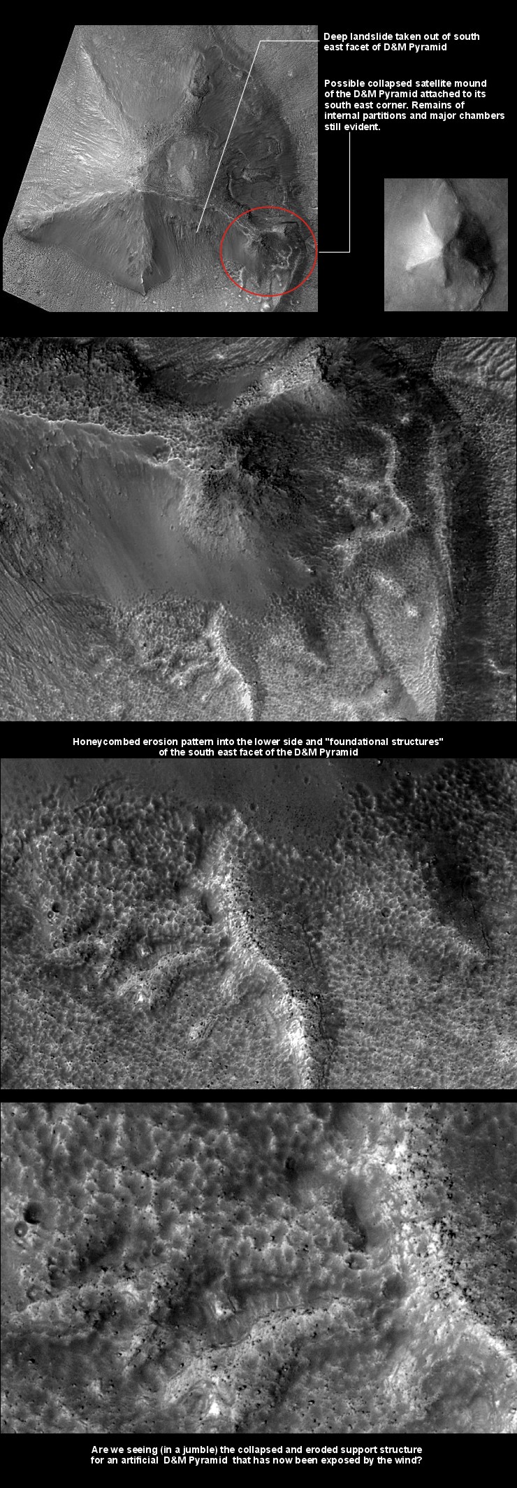 As the image poster below shows, much of the lower surface of the south-east facet of the pyramid is intensely honeycombed - as is the facet's ridgeline. However, a major slope collapse has eaten deeply into most of this facet. This has presumably destroyed or buried any evidence for artificiality in the affected areas.