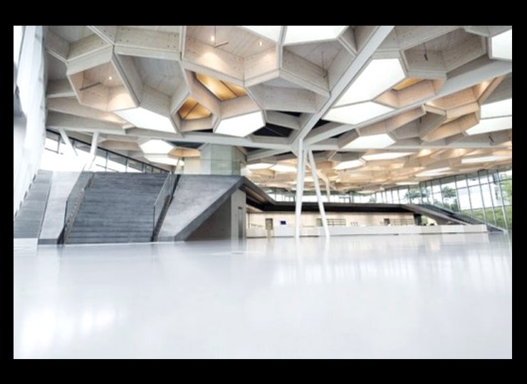 Another possible reason why the ruins of an artificial structure might not follow a uniform geometry is that it was built to an irregular pattern in the first place. Modern architects are beginning to abandon regular geometry. In the next image the structural grid that supports the building's roof is very irregular. The polygons in the grid have zero uniformity. In the past architects would have avoided arrangements like this because of the difficulties in calculating load bearings and in manufacturing the non-standardised components. Now computers can model any complex load bearings and computer directed manufacturing methods can cope with non-standardised components.