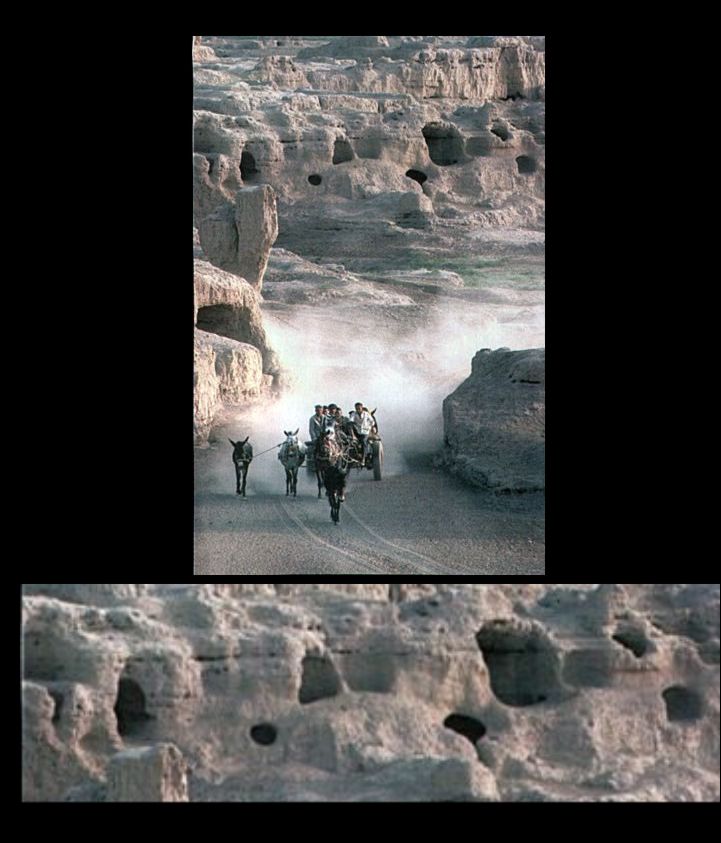 If we consider the position that the honeycombing in the D&M is due to it being an arcology, then why doesn't it conform to a more uniform geometry? One obvious reason is that collapse and erosion destroys the geometry of the structures making up buildings. In the image of the ruins of Gaochang below erosion has exposed interior rooms, but they look more like natural caves than architectural spaces.