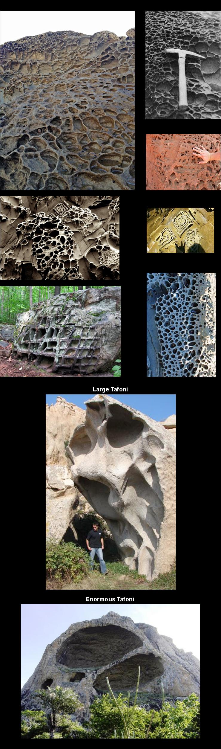One thing that is noticeable about tafoni surfaces is that the most intricate and dense lattice patterns only occur when the erosional hollows are small. In the previous image poster the last two images show how crude and sparse tafoni patterns are when the hollows are large. There is definitely an upper limit to how big the tafoni hollows can be and how intensive the tafoni pattern can remain. There is a trade-off between the two.