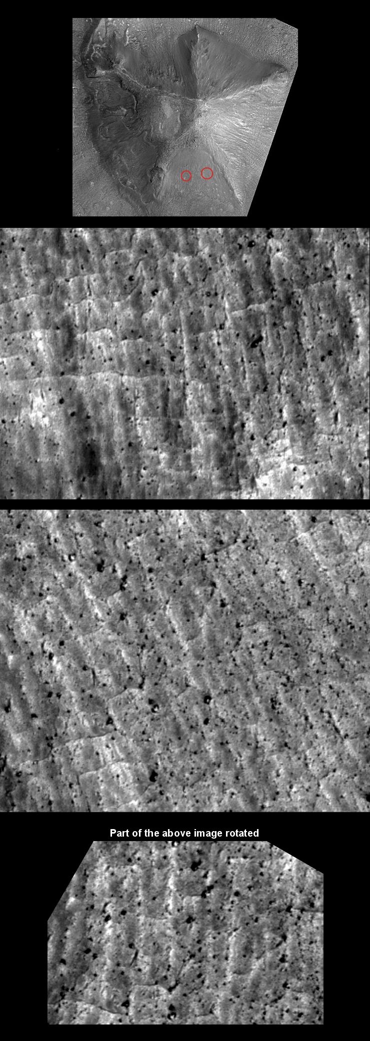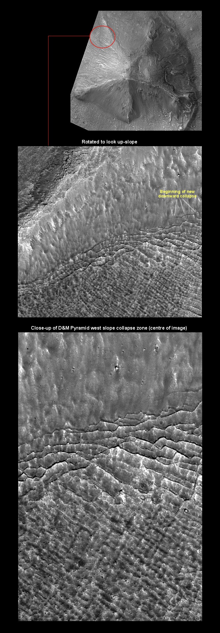 We can deduce that the surface is not breaking up and then merely land-sliding down the slope. If it was then the debris would flow over the top of the "suburbs" grid pattern covering the plain at the foot of the west facet, (see µµµ). The superb one foot per pixel resolution of the HiRISE image shows that it is not doing this. That means the facet is breaking up and subsiding downwards vertically at 90 degrees. This part of the D&M is undergoing a slow, progressive collapse - and if it is not flowing outwards then it must be becoming more compressed. The hypothesis that the D&M is an artificial arcology easily explains such vertical compression through the collapse of empty spaces within the interior.