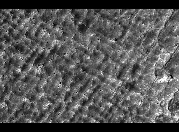 The next image is a close-up of the raised grid as it appears at the very bottom of the facet. (The image width is about 970 feet). The appearance is spookily similar to a bombed out city based around a right-angled street plan.
