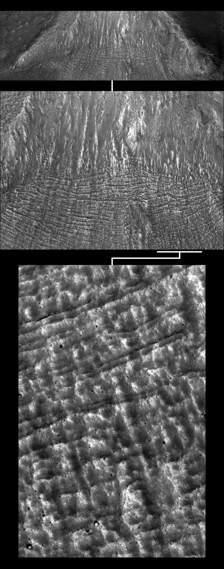 The final illustration poster provides a more distant viewpoint of the lateral fissures and four sided grids that are slowly growing up the western facet. The subsidence still seems to be in action, so in the future even more of this facet will be covered with grids. The last image in the illustration shows a full resolution strip up another part of the facet. Yet again the break-up of the surface evolves from newer fissures higher up the facet to four sided grids lower down the facet.
